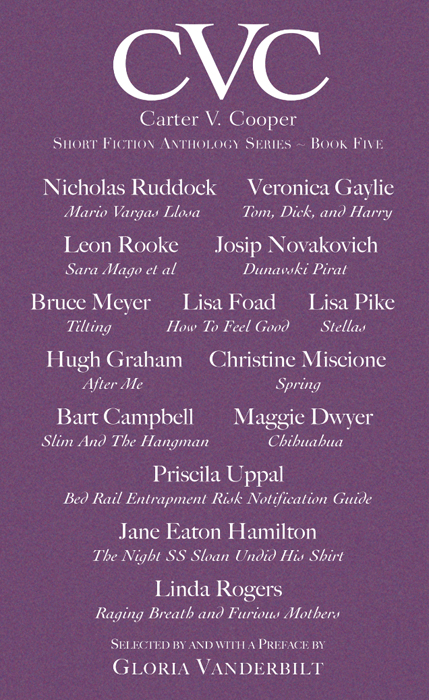 From writer, artist and philanthropist, Gloria Vanderbilt, who sponsors one of the largest literary prizes in Canada, and who supports this unique Canadians-only short fiction publication. “I am proud and thrilled that all these wonderful writers are presented in the CVC Anthology. Carter, my son, Anderson Cooper’s brother, was just 23 when he died in 1988. He was a promising editor, writer, and, from the time he was a small child, a voracious reader. When a child dies, just as his adult life is beginning, in addition to the overwhelming grief, his family and friends are left with many unanswerable questions. I often wonder what would he be doing? What kind of man would he have become? If Carter were alive he would be 50 years old now. Some things are not knowable, of course, but I do know Carter would still be in love with writing, with words, and with stories. Carter came from a family of storytellers, and stories were a guide which helped him discover the world. Though I, and those who loved Carter, still hear his voice in our heads and in our hearts, my son¹s voice was silenced long ago. I hope this prize helps other writers find their voice, and helps them touch others’ lives with the mystery and magic of the written word.”